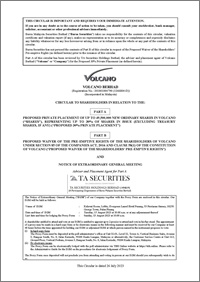 CIRCULAR TO SHAREHOLDERS IN RELATION TO THE: PART A:- PROPOSED PRIVATE PLACEMENT OF UP TO 49,500,000 NEW ORDINARY SHARES IN VOLCANO ("SHARES"), REPRESENTING UP TO 30% OF SHARES IN ISSUE (EXCLUDING TREASURY SHARES, IF ANY) ("PROPOSED 30% PRIVATE PLACEMENT"); AND PART B:- PROPOSED WAIVER OF THE PRE-EMPTIVE RIGHTS OF THE SHAREHOLDERS OF VOLCANO UNDER SECTION 85 OF THE COMPANIES ACT, 2016 AND CLAUSE 58(1) OF THE CONSTITUTION OF VOLCANO ("PROPOSED WAIVER OF THE SHAREHOLDERS' PRE-EMPTIVE RIGHTS")