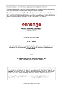 KENANGA INVESTMENT BANK BERHAD ("SYARIKAT") PENYATA BELI BALIK SAHAM BERHUBUNGAN DENGAN CADANGAN PEMBAHARUAN KUASA BAGI SYARIKAT UNTUK MEMBELI SAHAM SENDIRI SEHINGGA SEPULUH PERATUS (10%) DARI JUMLAH BILANGAN SAHAM TERBITAN SYARIKAT