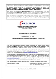 Greatech Technology Berhad ("GTB" or "the Company") - Share Buy-Back Statement in relation to the Proposed Renewal of Share Buy-Back Authority.