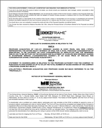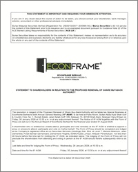 CIRCULAR/STATEMENT TO SHAREHOLDERS IN RELATION TO THE: PART A - PROPOSED ACQUISITION OF 7,081,321 ORDINARY SHARES IN IVORY PEARL SDN. BHD. ("IPSB"), REPRESENTING THE ENTIRE EQUITY INTEREST OF IPSB, FOR A TOTAL PURCHASE CONSIDERATION OF RM56,000,000, TO BE SATISFIED VIA CASH CONSIDERATION OF RM46,672,545 AND THE REMAINING RM9,327,455 TO BE SETTLED VIA THE ISSUANCE AND ALLOTMENT OF 16,500,000 NEW ORDINARY SHARES IN ECONFRAME BERHAD ("CONSIDERATION SHARES") AT AN ISSUE PRICE OF RM0.5653 PER CONSIDERATION SHARE ("PROPOSED ACQUISITION"); AND PART B - STATEMENT TO SHAREHOLDERS IN RELATION TO THE PROPOSED AUTHORITY FOR THE COMPANY TO PURCHASE ITS OWN SHARES OF UP TO 10% OF THE TOTAL NUMBER OF ISSUED SHARES OF THE COMPANY ("PROPOSED SHARE BUY-BACK")