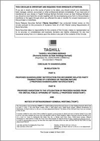 CIRCULAR TO SHAREHOLDERS IN RELATION TO THE (I) PROPOSED JOINT VENTURE IN WHICH YTB IMPRESSION SDN BHD ("YTBI" OR THE "LANDOWNER"), A WHOLLY OWNED SUBSIDIARY OF YONG TAI BERHAD ("YTB") GRANTS TAGHILL LAND SDN BHD (FORMERLY KNOWN AS UFUK MERCU SDN BHD) ("TAGHILL LAND") THE EXCLUSIVE RIGHTS TO UNDERTAKE THE PROJECT (AS DEFINED HEREIN) ON PART OF A PARCEL OF LEASEHOLD LAND BEARING THE MASTER TITLE NO. PN 63119, LOT 15001, LOCATED AT KAWASAN BANDAR XLIV, DISTRICT OF MELAKA TENGAH, STATE OF MELAKA, MEASURING APPROXIMATELY 2.02 HECTARES (THE "LAND") ("PROPOSED JOINT VENTURE"); AND (II) PROPOSED DIVERSIFICATION OF THE EXISTING BUSINESS OF TAGHILL AND ITS SUBSIDIARIES ("TAGHILL GROUP" OR THE "GROUP") TO INCLUDE THE BUSINESS OF PROPERTY DEVELOPMENT ("PROPERTY DEVELOPMENT BUSINESS") ("PROPOSED DIVERSIFICATION") (COLLECTIVELY, THE "PROPOSALS")