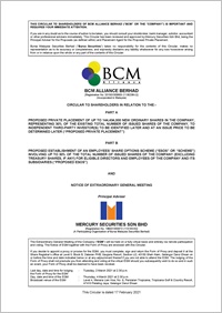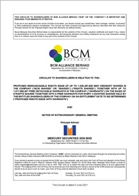 CIRCULAR TO SHAREHOLDERS IN RELATION TO THE PROPOSED RENOUNCEABLE RIGHTS ISSUE OF UP TO 1,220,467,629 NEW ORDINARY SHARES IN THE COMPANY ("BCM SHARES" OR "SHARES") ("RIGHTS SHARES") TOGETHER WITH UP TO 1,017,056,357 FREE DETACHABLE WARRANTS IN THE COMPANY ("WARRANTS") ON THE BASIS OF 6 RIGHTS SHARES TOGETHER WITH 5 FREE WARRANTS FOR EVERY 4 EXISTING SHARES HELD BY THE ENTITLED SHAREHOLDERS OF THE COMPANY ON AN ENTITLEMENT DATE TO BE DETERMINED ("PROPOSED RIGHTS ISSUE WITH WARRANTS")