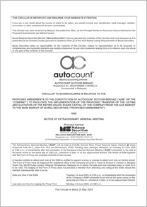 CIRCULAR TO SHAREHOLDERS IN RELATION TO THE PROPOSED AMENDMENTS TO THE CONSTITUTION OF AUTOCOUNT DOTCOM BERHAD ("ADB" OR THE "COMPANY") TO FACILITATE THE IMPLEMENTATION OF THE PROPOSED TRANSFER OF THE LISTING AND QUOTATION OF THE ENTIRE ISSUED SHARE CAPITAL OF THE COMPANY FROM THE ACE MARKET TO THE MAIN MARKET OF BURSA MALAYSIA SECURITIES BERHAD ("PROPOSED AMENDMENTS")