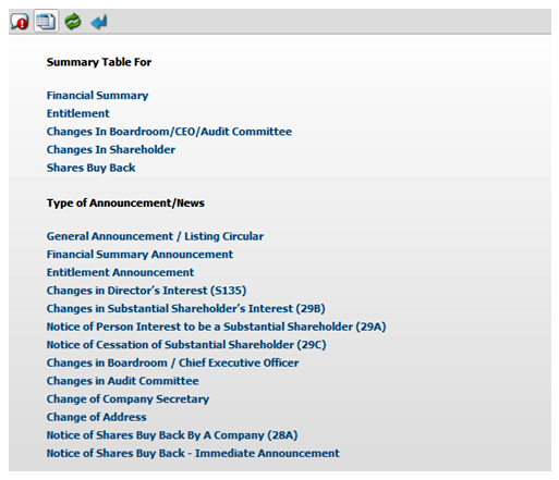 Users can sort the announcements by categories such as Entitlements, Financial Summary (for Quarterly Results), Share Buy Back, Changes in Boardroom, General Announcements, etc to quickly find the information they need!