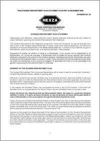 CIRCULAR TO SHAREHOLDERS IN RELATION TO THE PROPOSED ESTABLISHMENT OF A DIVIDEND REINVESTMENT PLAN ("DRP"), WHICH WILL PROVIDE THE SHAREHOLDERS OF HEXZA CORPORATION BERHAD ("HEXZA" OR THE "COMPANY") WITH AN OPTION TO ELECT, IN WHOLE OR IN PART, TO REINVEST THEIR CASH DIVIDEND AS MAY BE DECLARED BY HEXZA, WHETHER INTERIM, FINAL, SPECIAL OR ANY OTHER TYPES OF CASH DIVIDEND IN NEW ORDINARY SHARES OF HEXZA ("PROPOSED DRP")
