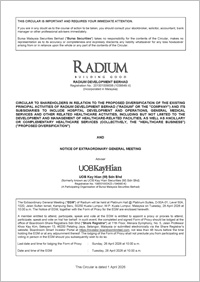 CIRCULAR TO SHAREHOLDERS IN RELATION TO THE PROPOSED DIVERSIFICATION OF THE EXISTING PRINCIPAL ACTIVITIES OF RADIUM DEVELOPMENT BERHAD ("RADIUM" OR THE "COMPANY") AND ITS SUBSIDIARIES TO INCLUDE HOSPITAL DEVELOPMENT AND OPERATIONS, GENERAL MEDICAL SERVICES AND OTHER RELATED HEALTHCARE ACTIVITIES, INCLUDING BUT NOT LIMITED TO THE DEVELOPMENT AND MANAGEMENT OF HEALTHCARE-RELATED FACILITIES, AS WELL AS ANCILLARY OR COMPLEMENTARY HEALTHCARE SERVICES (COLLECTIVELY, THE "HEALTHCARE BUSINESS") ("PROPOSED DIVERSIFICATION")