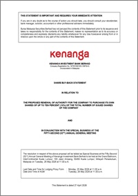 KENANGA INVESTMENT BANK BERHAD ("THE COMPANY") SHARE BUY-BACK STATEMENT IN RELATION TO THE PROPOSED RENEWAL OF AUTHORITY FOR THE COMPANY TO PURCHASE ITS OWN SHARES OF UP TO TEN PERCENT (10%) OF THE TOTAL NUMBER OF ISSUED SHARES OF THE COMPANY