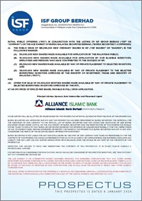INITIAL PUBLIC OFFERING ("IPO") IN CONJUNCTION WITH THE LISTING OF ISF GROUP BERHAD ("ISF" OR "COMPANY") ON THE ACE MARKET OF BURSA MALAYSIA SECURITIES BERHAD ("BURSA SECURITIES") COMPRISING: (I) THE PUBLIC ISSUE OF 185,299,000 NEW ORDINARY SHARES IN ISF ("ISF SHARES" OR "SHARES") IN THE FOLLOWING MANNER: (A) 50,000,000 NEW SHARES MADE AVAILABLE FOR APPLICATION BY THE MALAYSIAN PUBLIC; (B) 15,000,000 NEW SHARES MADE AVAILABLE FOR APPLICATION BY OUR ELIGIBLE DIRECTORS, EMPLOYEES AND PERSONS WHO HAVE CONTRIBUTED TO THE SUCCESS OF ISF; (C) 85,299,000 NEW SHARES MADE AVAILABLE BY WAY OF PRIVATE PLACEMENT TO SELECTED INVESTORS; AND (D) 35,000,000 NEW SHARES MADE AVAILABLE BY WAY OF PRIVATE PLACEMENT TO THE SELECTED BUMIPUTERA INVESTORS APPROVED BY THE MINISTRY OF INVESTMENT, TRADE AND INDUSTRY OF MALAYSIA ("MITI"); AND (II) OFFER FOR SALE OF 90,000,000 EXISTING SHARES MADE AVAILABLE BY WAY OF PRIVATE PLACEMENT TO SELECTED BUMIPUTERA INVESTORS APPROVED BY THE MITI, AT AN IPO PRICE OF RM0.33 PER SHARE, PAYABLE IN FULL UPON APPLICATION.