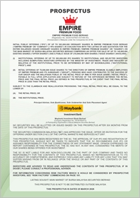 INITIAL PUBLIC OFFERING ("IPO") OF UP TO 363,000,000 ORDINARY SHARES IN EMPIRE PREMIUM FOOD BERHAD ("EMPIRE PREMIUM" OR "COMPANY") ("IPO SHARES") IN CONJUNCTION WITH THE LISTING OF AND QUOTATION FOR THE ENTIRE ENLARGED ISSUED ORDINARY SHARES IN EMPIRE PREMIUM ("EMPIRE PREMIUM SHARES" OR "SHARES") ON THE MAIN MARKET OF BURSA MALAYSIA SECURITIES BERHAD ("LISTING") COMPRISING AN OFFER FOR SALE OF UP TO 145,000,000 EXISTING SHARES ("OFFER SHARES") AND A PUBLIC ISSUE OF 218,000,000 NEW SHARES ("ISSUE SHARES") INVOLVING: (I) INSTITUTIONAL OFFERING OF UP TO 293,000,000 IPO SHARES TO INSTITUTIONAL AND SELECTED INVESTORS INCLUDING BUMIPUTERA INVESTORS APPROVED BY THE MINISTRY OF INVESTMENT, TRADE AND INDUSTRY OF MALAYSIA AT THE INSTITUTIONAL PRICE TO BE DETERMINED BY WAY OF BOOKBUILDING ("INSTITUTIONAL PRICE"); AND (II) RETAIL OFFERING OF 70,000,000 ISSUE SHARES TO THE DIRECTORS OF EMPIRE PREMIUM, ELIGIBLE EMPLOYEES OF EMPIRE PREMIUM AND ITS SUBSIDIARY ("GROUP"), PERSONS WHO HAVE CONTRIBUTED TO THE SUCCESS OF THE GROUP AND THE MALAYSIAN PUBLIC AT THE RETAIL PRICE OF RM0.70 PER ISSUE SHARE ("RETAIL PRICE"), PAYABLE IN FULL UPON APPLICATION AND SUBJECT TO REFUND OF THE DIFFERENCE BETWEEN THE RETAIL PRICE AND THE FINAL RETAIL PRICE (AS DEFINED IN THIS PROSPECTUS) IN THE EVENT THAT THE FINAL RETAIL PRICE IS LESS THAN THE RETAIL PRICE, SUBJECT TO THE CLAWBACK AND REALLOCATION PROVISIONS. THE FINAL RETAIL PRICE WILL BE EQUAL TO THE LOWER OF: (A) THE RETAIL PRICE; OR (B) THE INSTITUTIONAL PRICE.