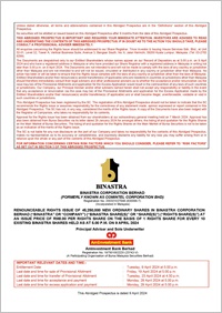 RENOUNCEABLE RIGHTS ISSUE OF 45,250,000 NEW ORDINARY SHARES IN BINASTRA CORPORATION BERHAD ("BINASTRA" OR "COMPANY") ("BINASTRA SHARE(S)" OR "SHARE(S)") ("RIGHTS SHARE(S)") AT AN ISSUE PRICE OF RM0.80 PER RIGHTS SHARE ON THE BASIS OF 1 RIGHTS SHARE FOR EVERY 10 EXISTING BINASTRA SHARES HELD AS AT 5.00 P.M. ON 9 APRIL 2024