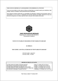JAKS RESOURCES BERHAD ("JAKS" or the "Company") - NOTICE TO WARRANT HOLDERS OF THE WARRANTS 2020/2025 IN RELATION TO THE EXPIRY AND FINAL EXERCISE OF THE WARRANTS 2020/2025