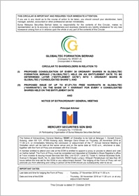 CIRCULAR TO SHAREHOLDERS IN RELATION TO (I) PROPOSED CONSOLIDATION OF EVERY 20 ORDINARY SHARES IN GLOBALTEC FORMATION BERHAD ("GLOBALTEC") HELD ON AN ENTITLEMENT DATE TO BE DETERMINED LATER ("ENTITLEMENT DATE") INTO 1 ORDINARY SHARE IN GLOBALTEC ("CONSOLIDATED SHARE"); AND (II) PROPOSED ISSUE OF UP TO 67,271,723 FREE WARRANTS IN GLOBALTEC ("WARRANTS") ON THE BASIS OF 1 WARRANT FOR EVERY 4 CONSOLIDATED SHARES HELD ON THE ENTITLEMENT DATE