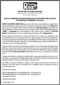 Notice To Warrant Holders In Relation To The Expiry And Last Date For Exercise Of Warrants 2021/2026